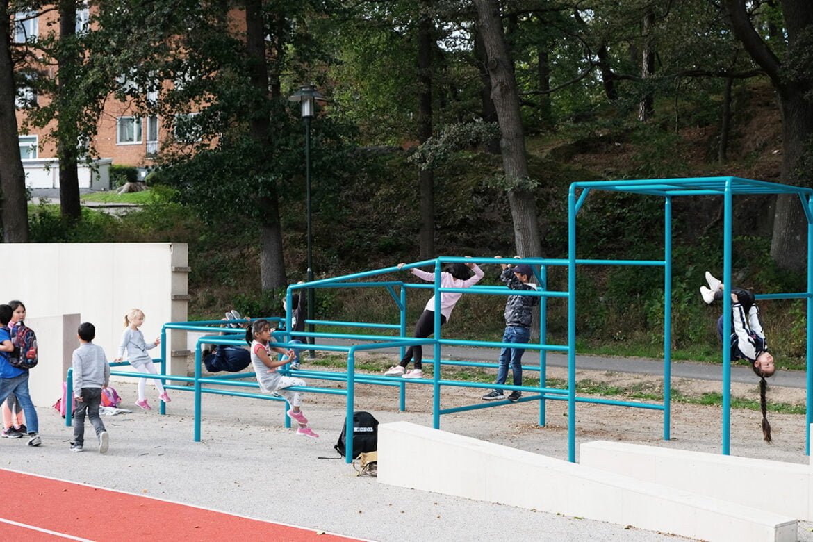 The spine of the park is the orange running track with the traditional 100 m. sprint as well as playful and challenging topographies. The sides of the track are dotted with climbing walls, playgrounds, trampolines, a field for playing boules and more. The park also offers calmer types of recreation with tables, benches, and a barbecue area. One can get an overview of and new perspective on the park from a number of elevated platforms. The broad variety of functions makes the park a meeting place for many different kinds of people – it has become a social gathering point for children, teenagers and adults in Rågsved.