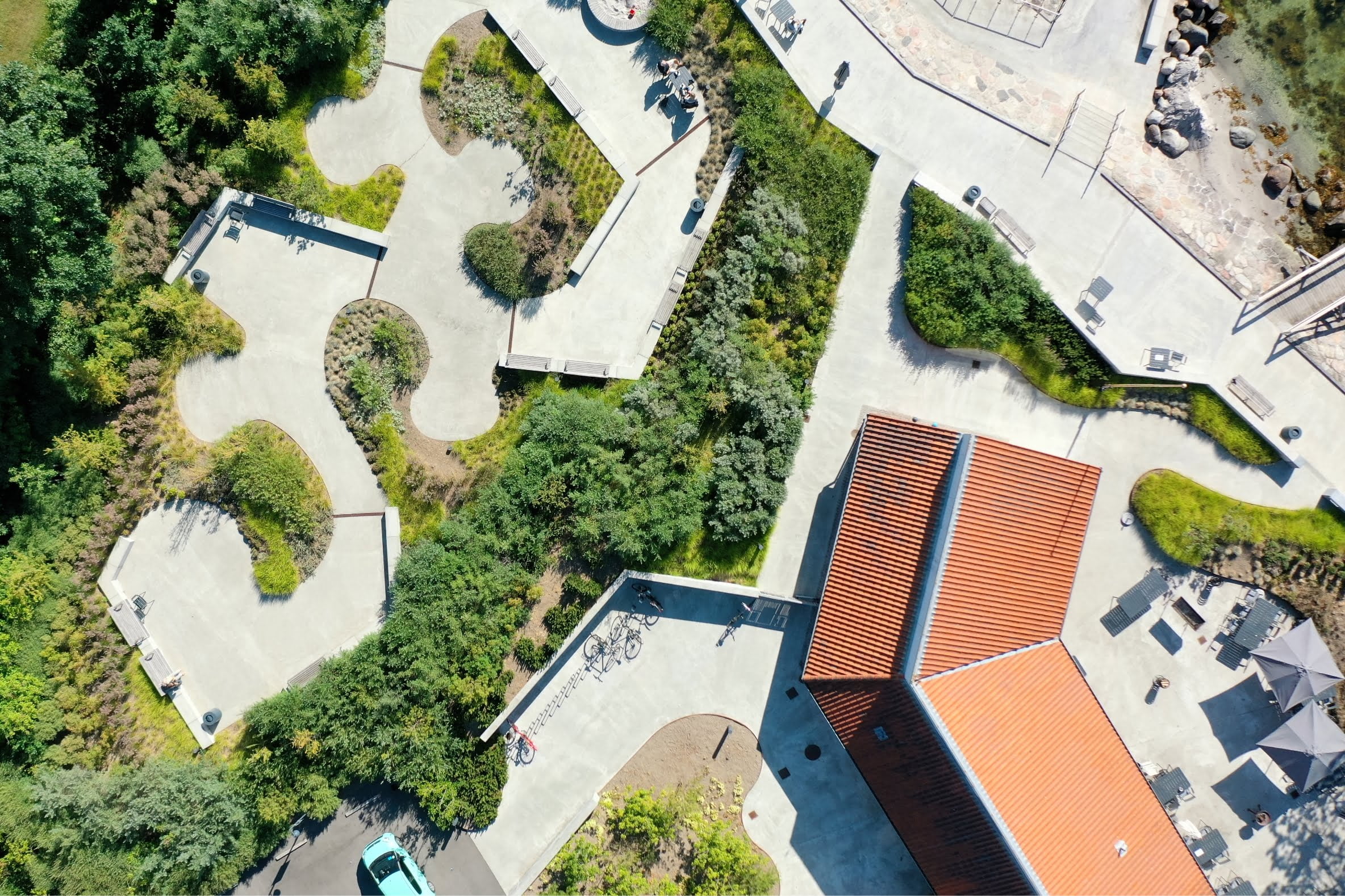Stranden was also given new facilities for swimming and relaxing that can be used by everyone regardless of level of mobility, and the parking space has been optimized to serve the users needs. The same is true of the concrete trails that have been wound through the coast-inspired planting. This area has a number of spaces with seating as well as a more secluded area for playing, and such accessible recesses provide shelter and privacy. The ramp leading into the water makes the ocean easy to access for both wheelchair users and pedestrians.