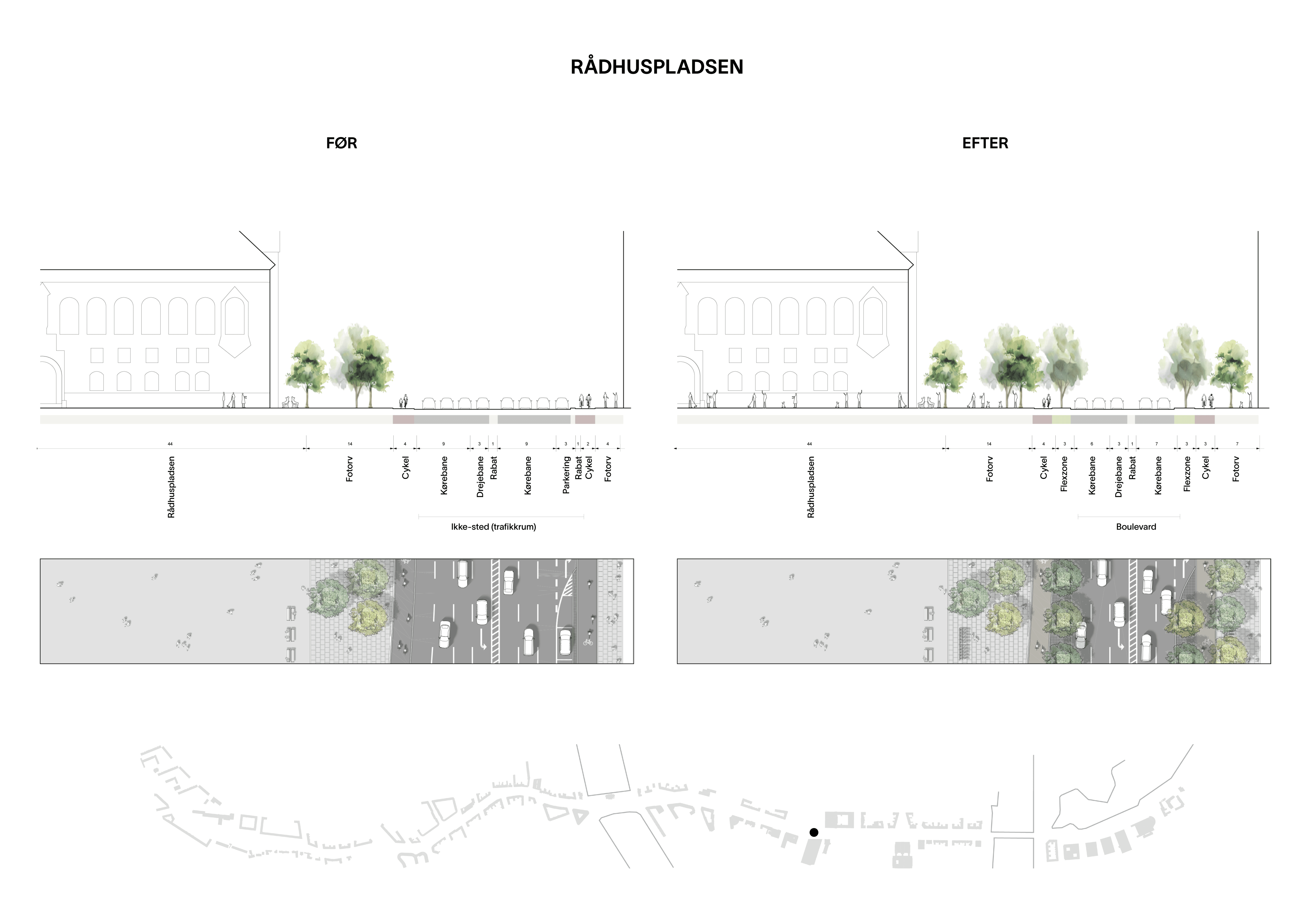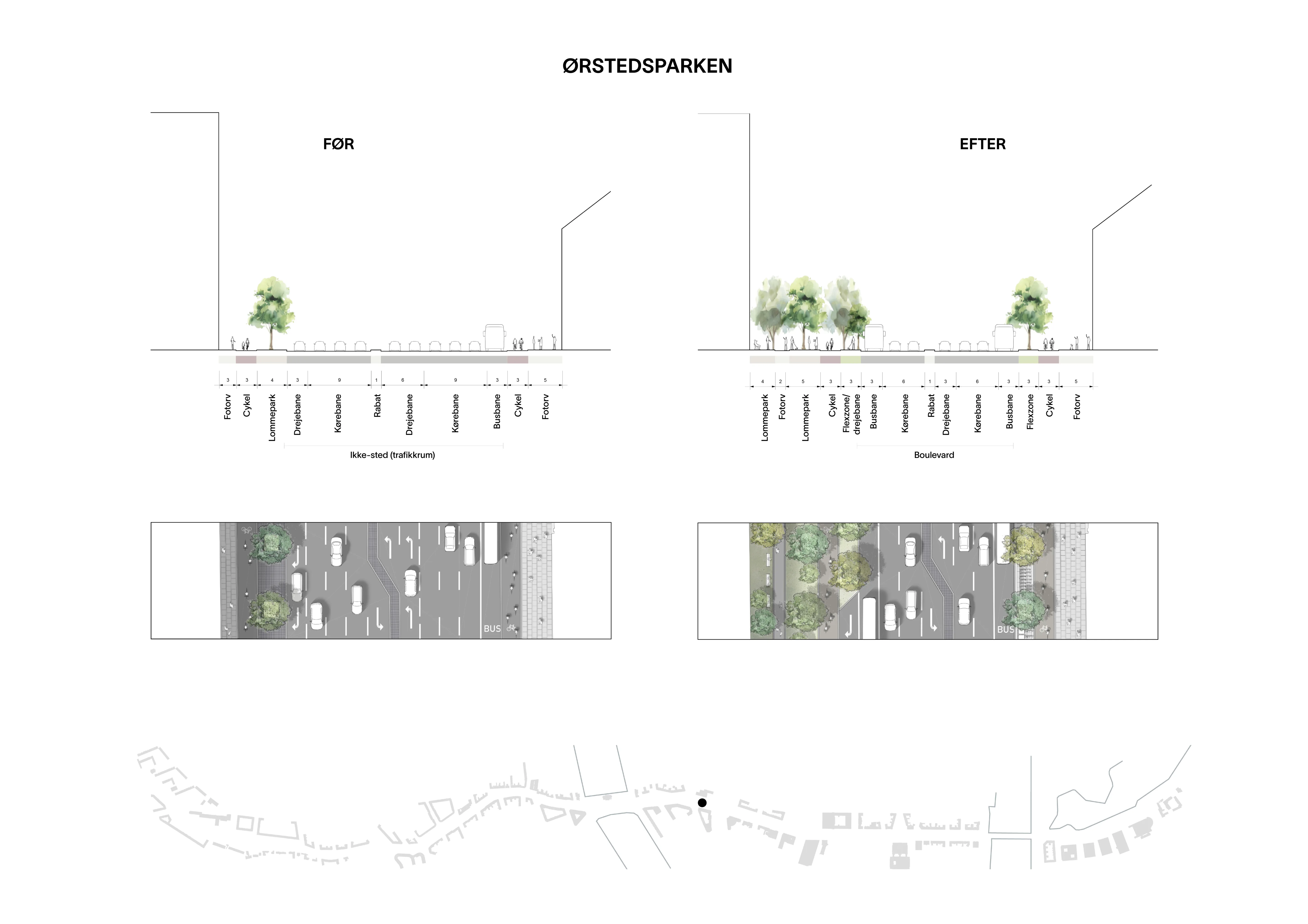 I al sin enkelthed opnås dette projekt alene ved i grove træk at udtage to vejbaner og den eksisterende parkering langs boulevarden. Dette gøres med åbne øjne for at sikre et mere enkelt og styret trafikflow og genskabe en mere ligeværdig fordeling af pladsen mellem biler og mennesker.