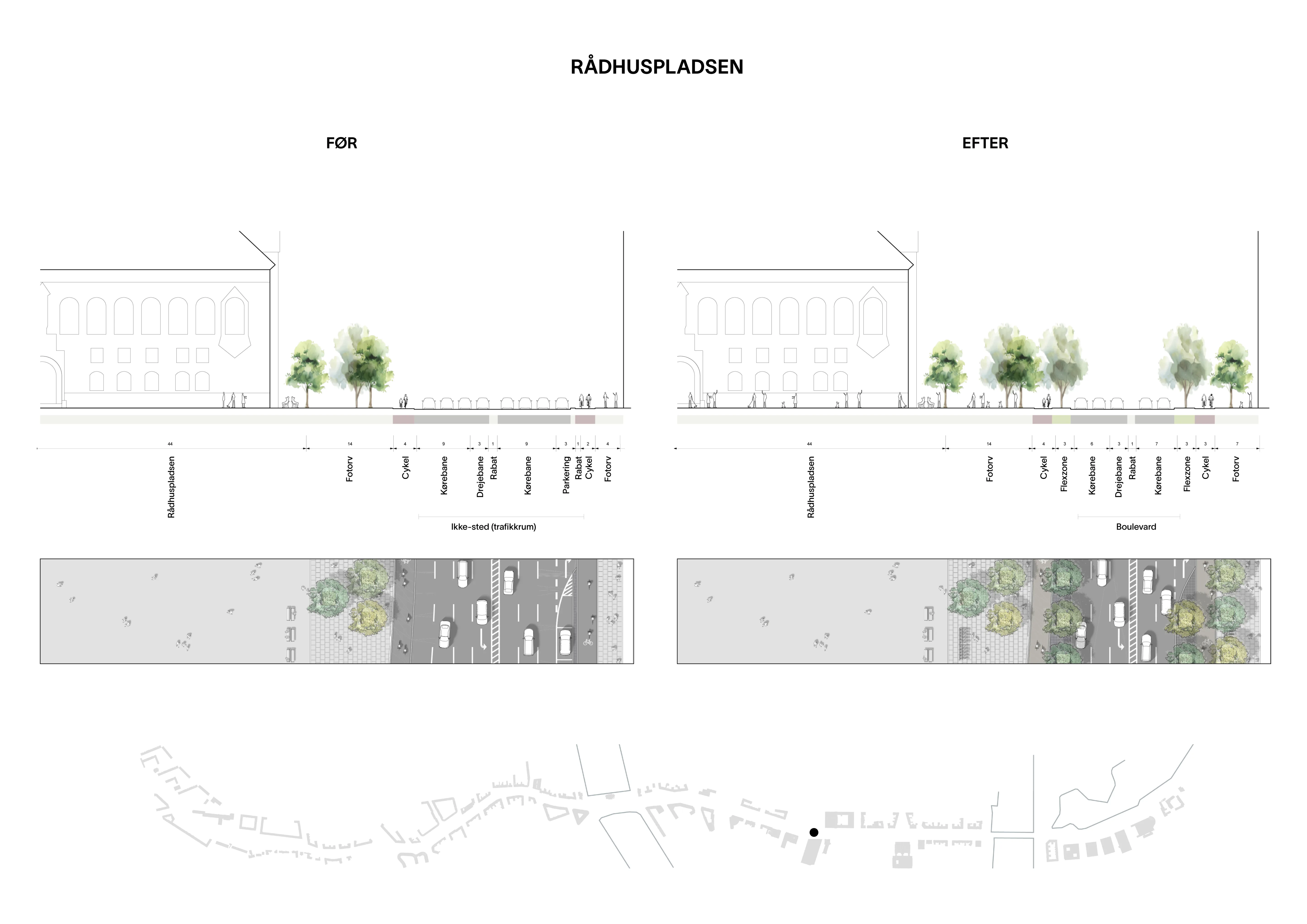 Vi bearbejder den yderste vejbane, der tages fra bilerne, som byens nye flexzone. Det vil sige en zone, der kan skifte karakter og altid tilpasses byens specifikke behov, hvad end det er i form af byrum, parkrum eller som infrastruktur for biler, busser eller cykler. Det eneste faste princip er allétræernes taktfaste rytme!