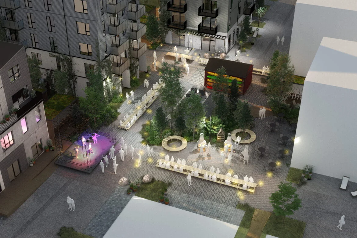 ”Three main squares with different programming connect to the road system and create meeting points for the locals.”
