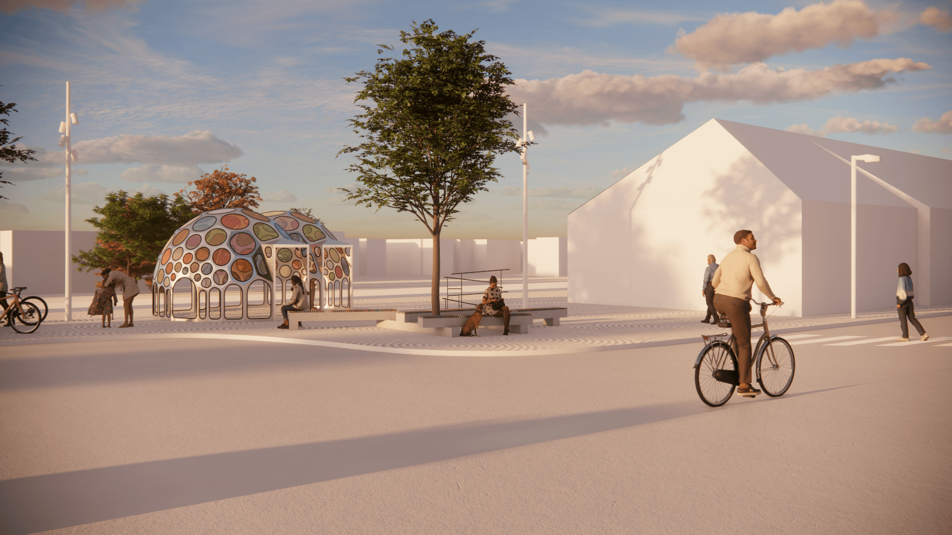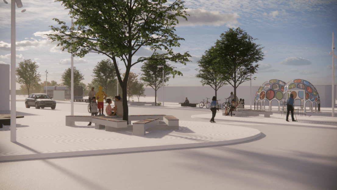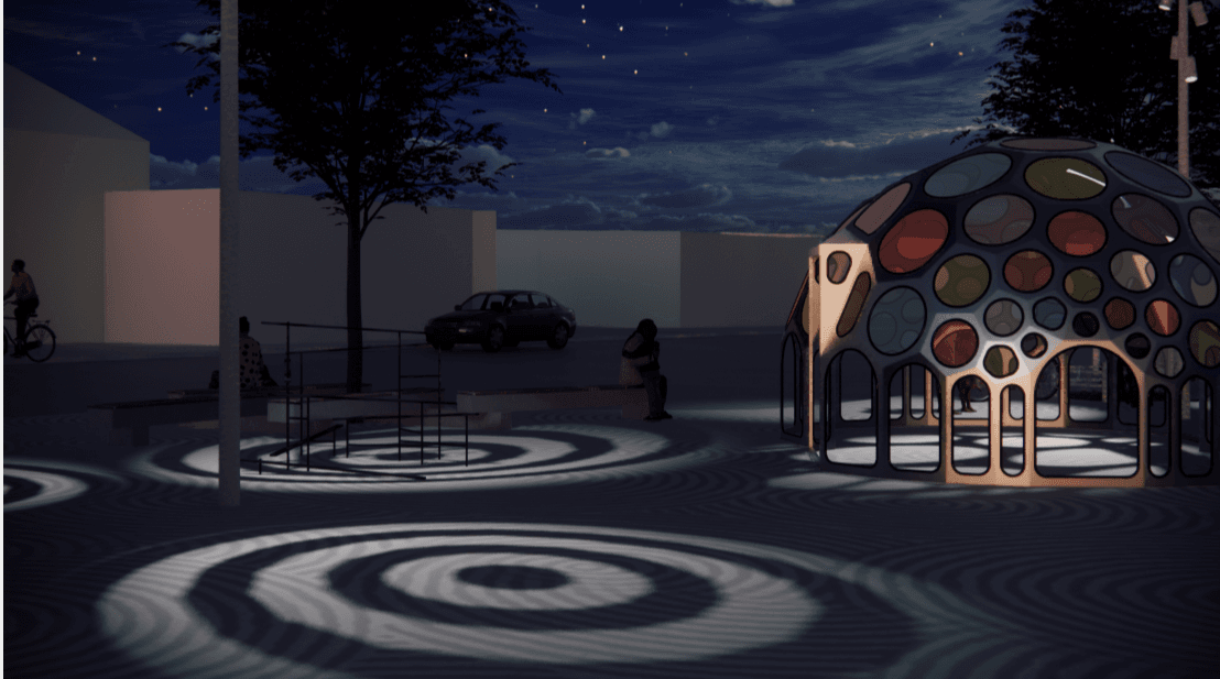 The design integrates lighting, planting, paving, and engaging spatial elements to enhance the overall experience. A colorful pavilion adds a playful and vibrant focal point, contributing to a dynamic and welcoming atmosphere.