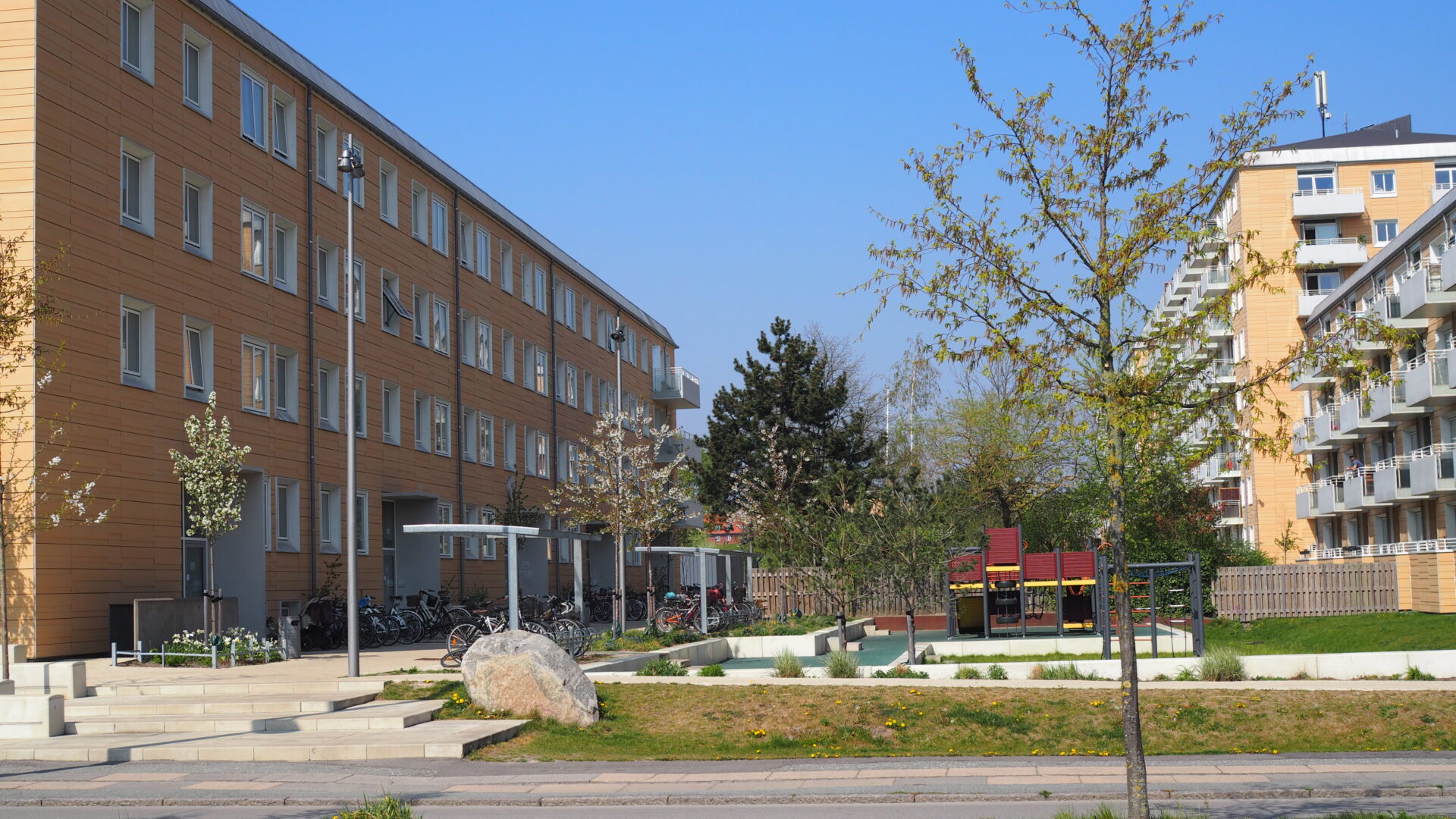 The big buildings were providing challenges with scale, light, wind and security. Kragh Berglund worked a lot with user involvement, our focus was to create spaces where the human scale is represented and to work on exploiting the areas with sun. “Solstriben/The sun ray” an axis going through the area is the space with the most hours of sunshine – this axis is the central place where we create room for activity, meetings and recreation