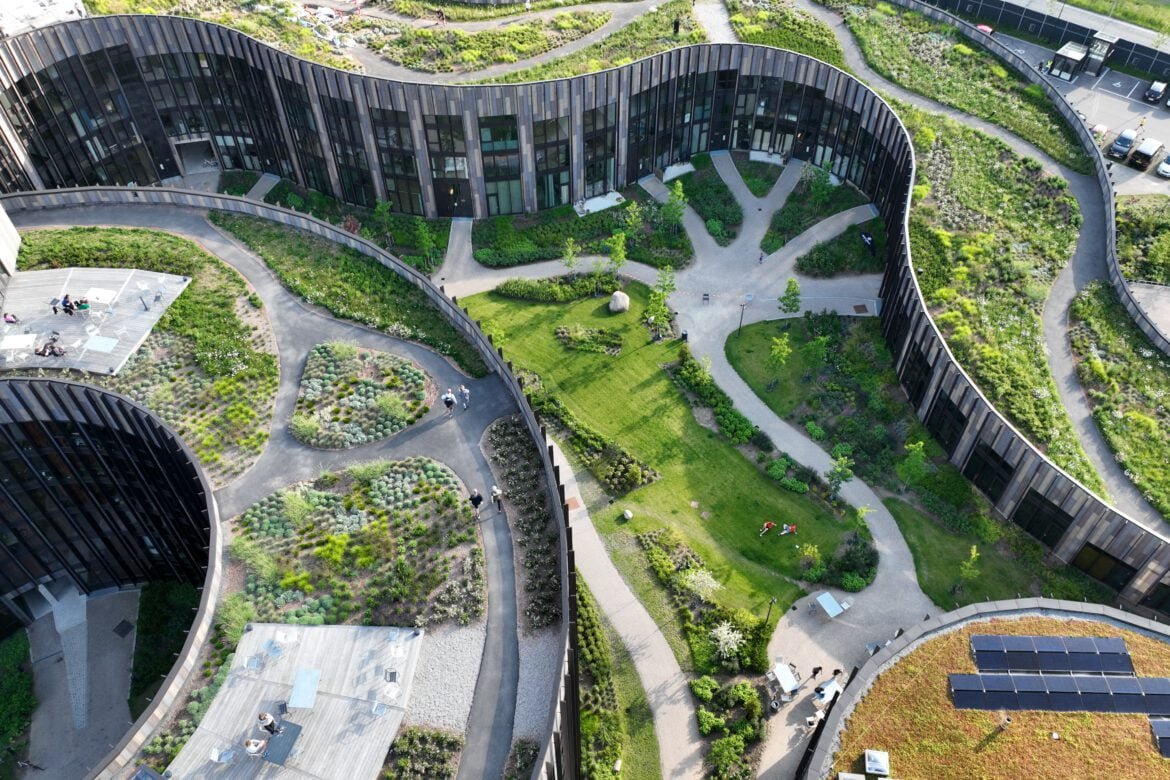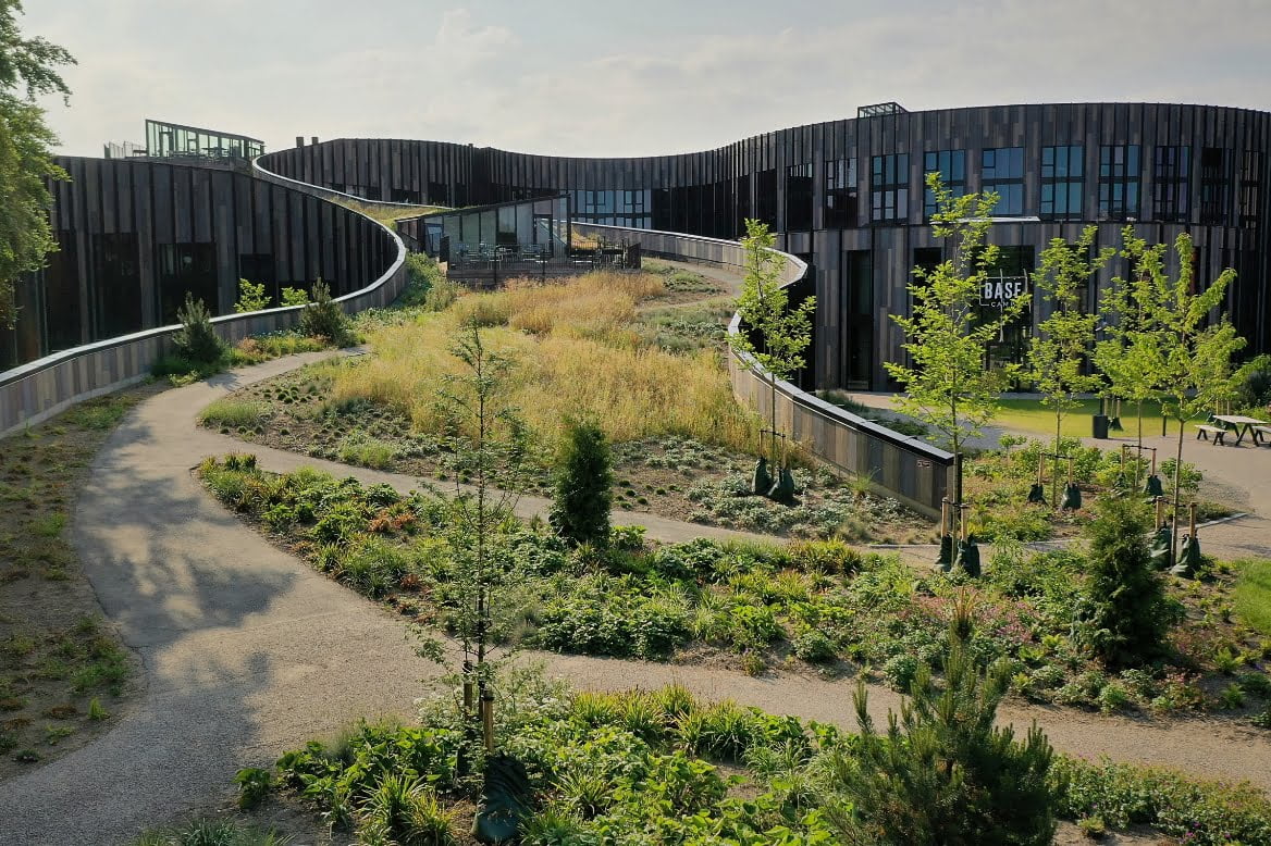 Basecamp is part of a lively green area in Lyngby, surrounded by Sorgenfri Cemetery to the north and the and Lyngby Lake to the west. This the location for 640 new apartments for students, researchers, and seniors. The landscape preserves the area’s lush character. An organically winding network of paths connect the area on the roof of the building. The planting is dense and park-like with scattered trees and many different types of landscape with cut grasses, tall grasses, and plants.