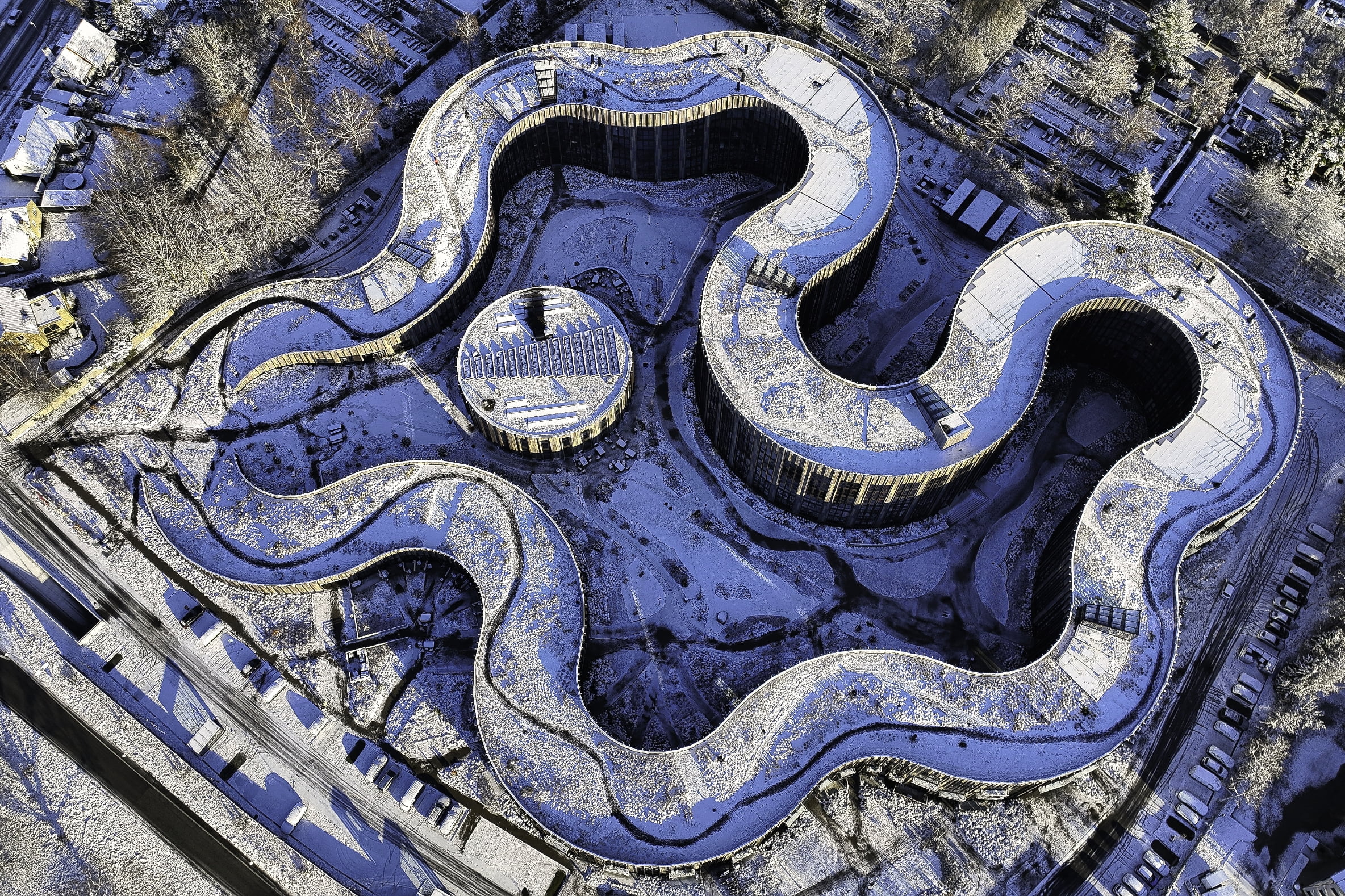 The shape of the building helps create interesting spaces along the exterior facades as well as an unusual inner courtyard with little terraces and recreational areas with a playing field and a playground.
