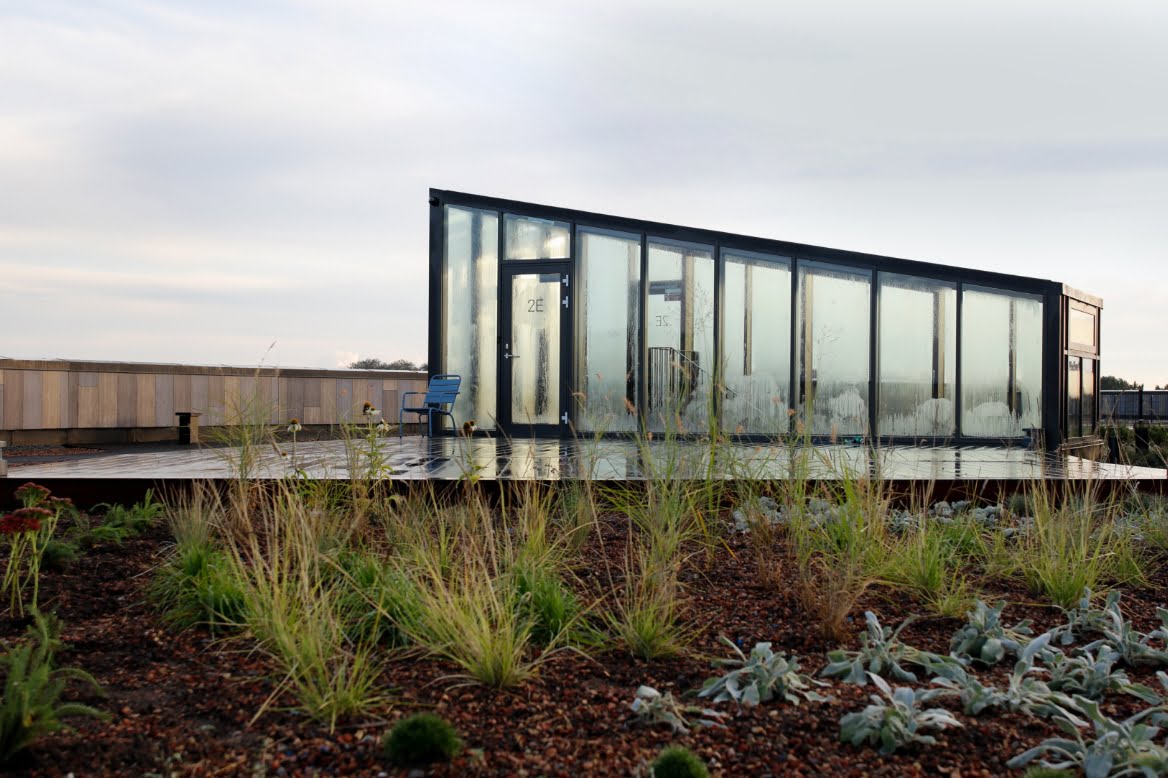 The paths in the area have been drawn away from the building in order to create a private zone around the residential areas in a natural way. The soft and organic shape of the trails helps frame the planting and create an interesting pathway through the area and across the roof. Most of the trails were planned without curbs to support the natural and park-like character of the area.